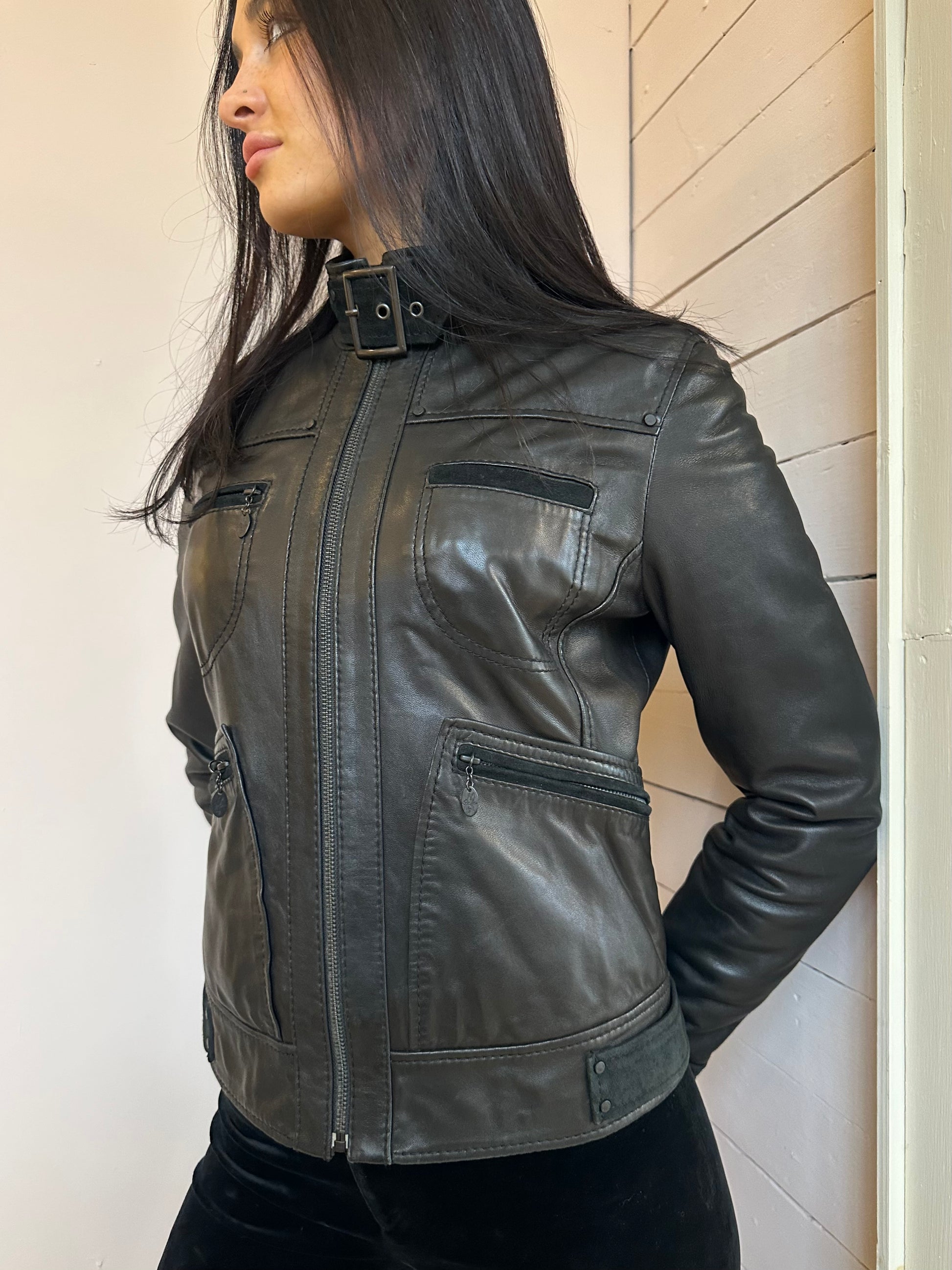 Black leather jacket by GUESS with suede panels and buckle details. Zip side and chest pockets. Zip fastening.