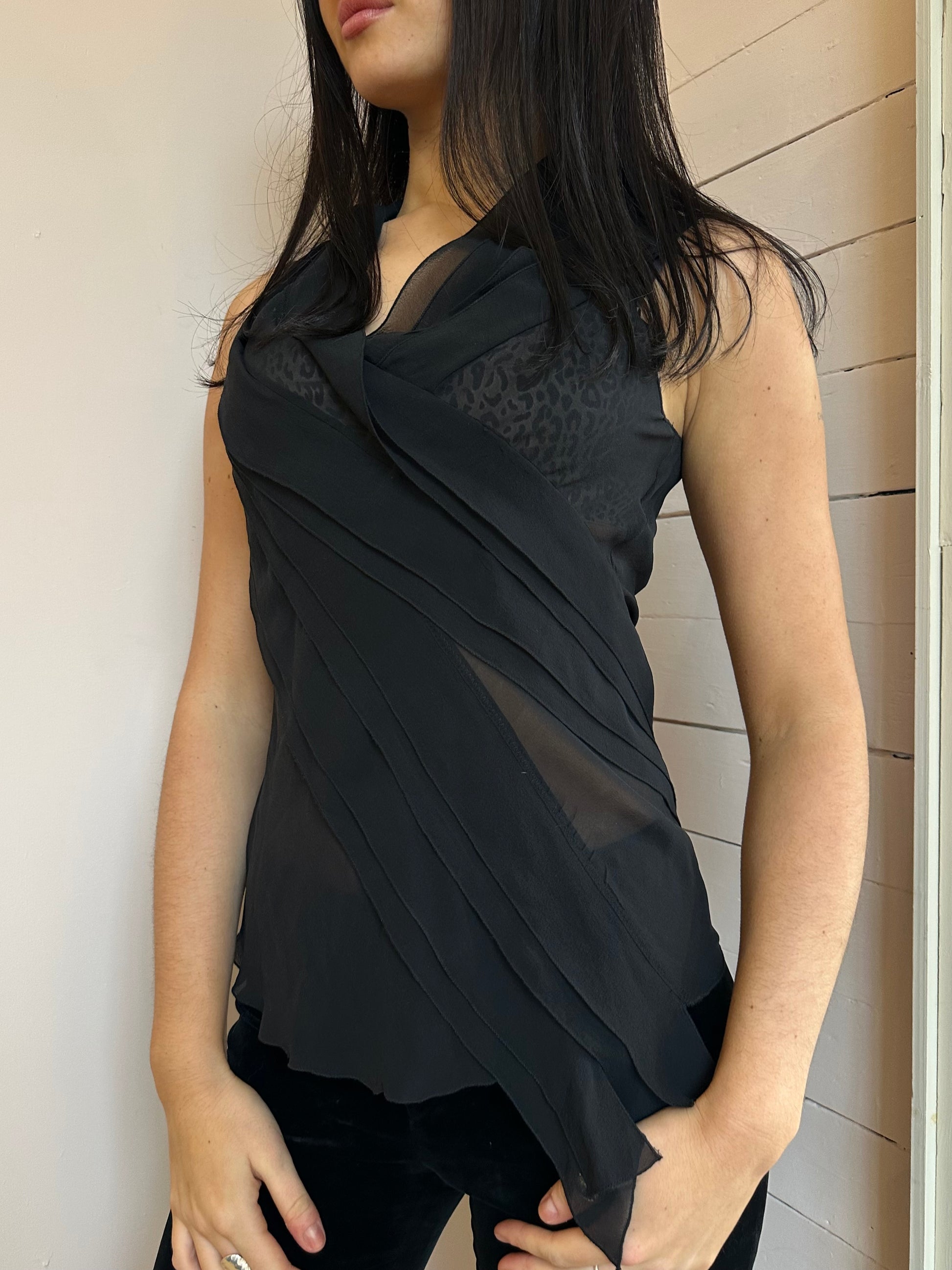 Black Ted Baker silk ruffle top. Sleeveless.